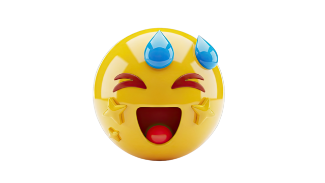Laughing star emoji PNG isolated on transparent background, yellow cartoon character with tears of joy for social media and design use