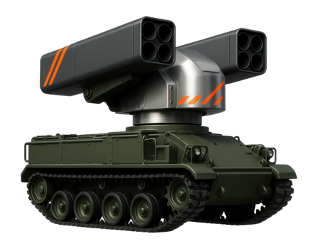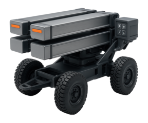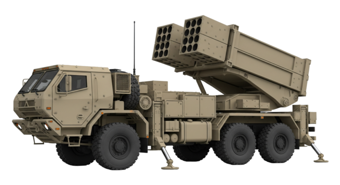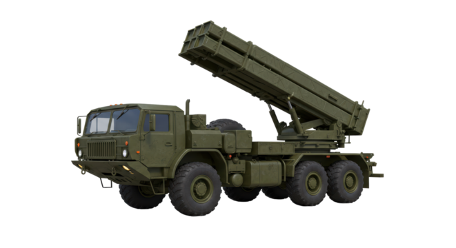 Modern artillery rocket launcher system in photorealistic detail showing a wheeled multiple rocket system design