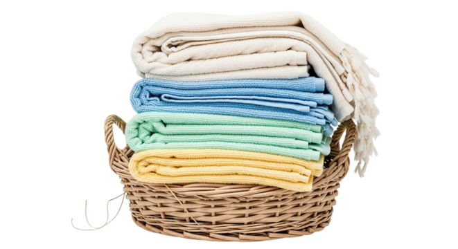 Freshly laundered colorful towels neatly folded in a rustic woven basket for a comforting spa