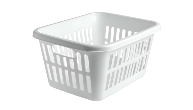 A white plastic laundry basket is set against a black background. It has a rectangular shape with many holes for air circulation