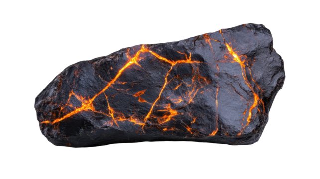 Striking charred lava rock with glowing molten cracks against a transparent, white background, png