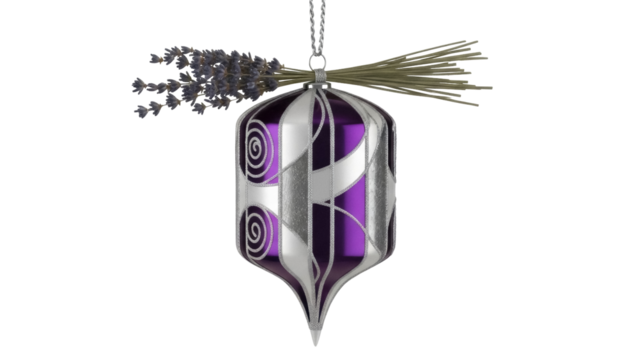 Isolated festive purple teardrop-shaped ornamental hanging with lavender sprig decoration