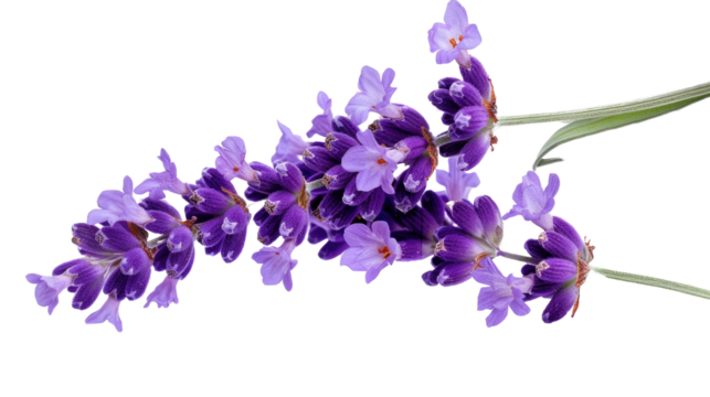 Photograph of a vibrant lavender flower, its purple petals exuding a calming fragrance, isolated on a transparent background.