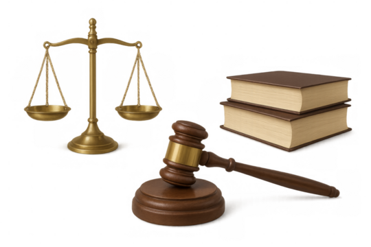 Brass scale of justice, leather-bound legal books, wooden gavel on a sound block.