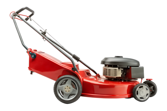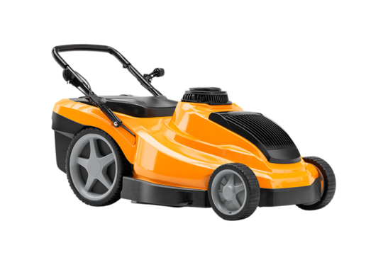 Orange and black lawnmower with wheels and handle image, Isolated, Transparent Png