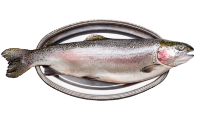 fresh whole trout in a metal plate isolated on transparent background, top view, flat lay