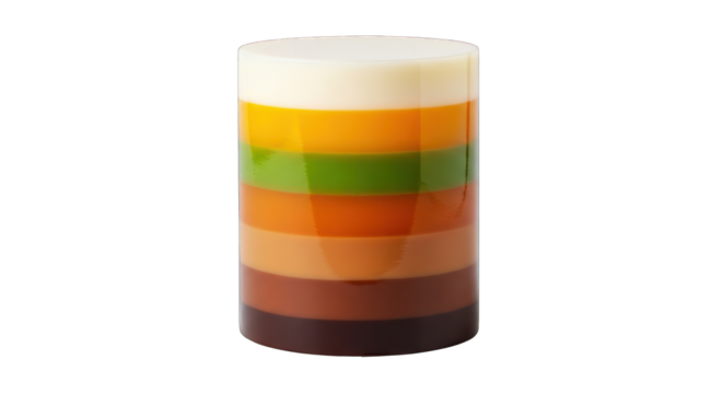 A clear glass cylinder holds layered red, green, and red liquids against a black backdrop.