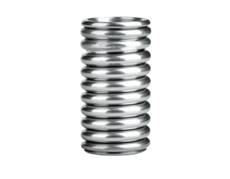 A close-up studio shot of a cylindrical metal compression spring stacked on a black background