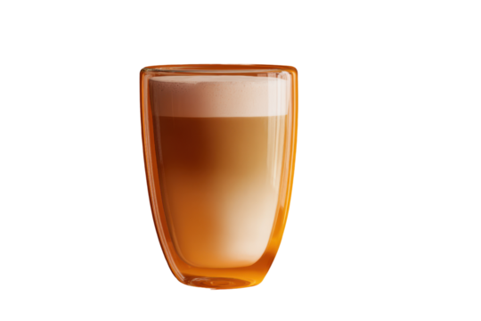 Double walled glass cup filled with layered coffee drink and foam beverage latte, Isolated On Transparent Background, Png Cut Out
