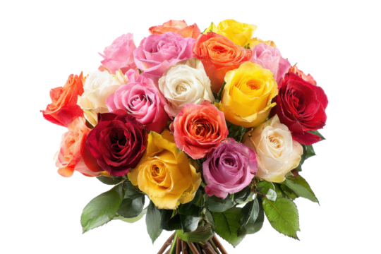 Bouquet of mixed multicolor roses with layered petals and fresh green stems, lush floral arrangement with visible leaves and natural bloom textures, isolated on transparent background.