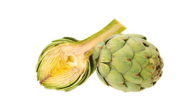 Fresh green artichoke with a half cross-section showing internal layers and heart isolated on a plain background.