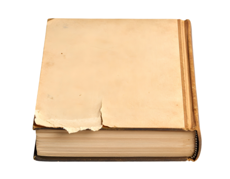 Vintage thick book with torn blank cover and yellowed pages lying closed on isolated background