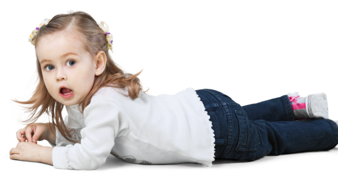 Adorable 7 weeks old Labrador dog puppy, laying down. Head up, looking towards camera. Isolated cutout on a transparent background.