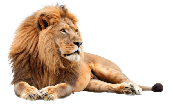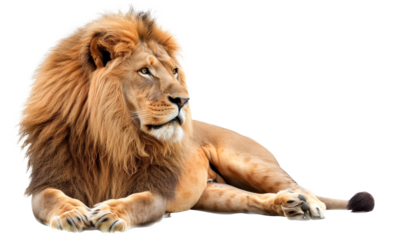 A stunning portrait of a majestic lion lying down, showcasing its magnificent mane and regal presence against a clean, white background. The lion's attentive expression and relaxed pose