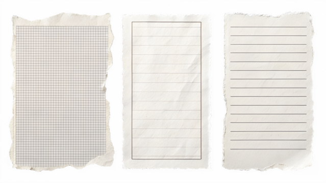 Three torn paper pieces with grid lines and horizontal lines isolated on transparent background