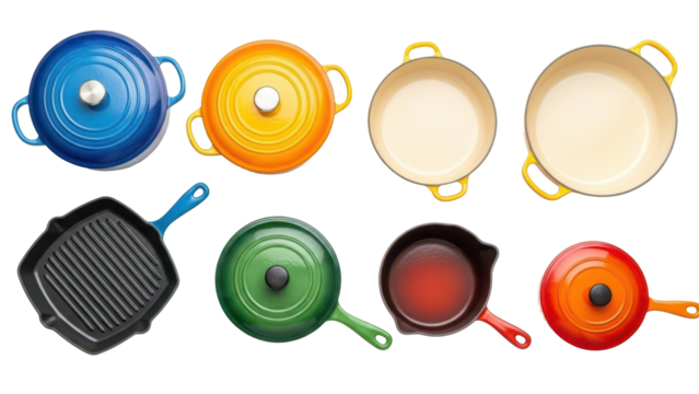 Top down flat lay of a set of colorful enameled cast iron cookware on a stovetop isolated on white background