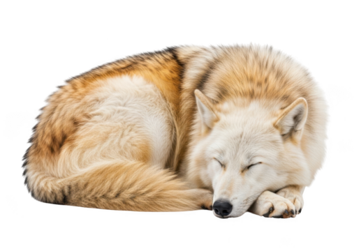 Sleeping wolf png image, canis lupus, wildlife animal, mammal, predator, canine, furry, cute, relaxing, dreamy, isolated on transparent background