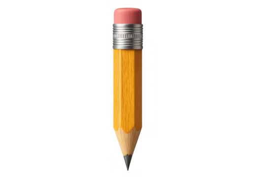 Yellow wooden pencil with pink eraser and sharp graphite lead standing upright on transparent background