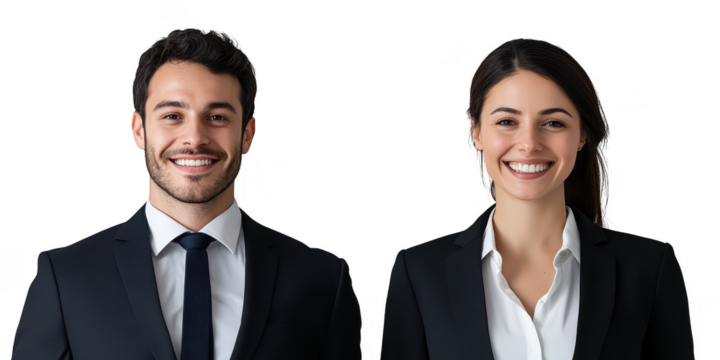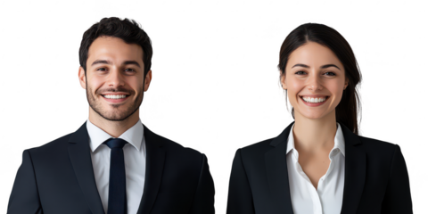 Two professionals sharing ideas while viewing a tablet, isolated on a white background.