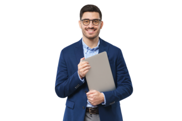Young smiling modern male teacher holding closed laptop in hands, waiting for students