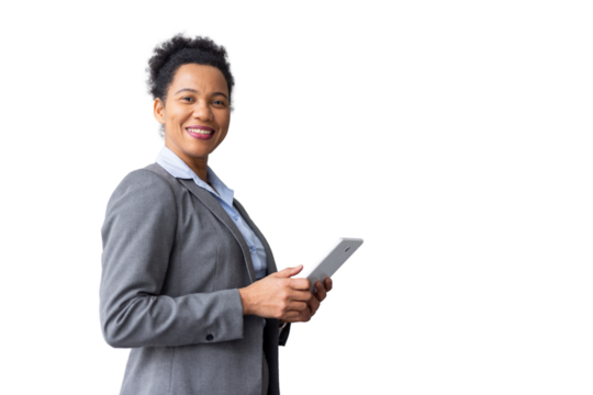The manager is a stylish blonde woman with glasses holding a tablet in the office of an employee entrepreneur. Transparent background.