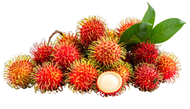 A close-up showcases a cluster of glossy, reddish-purple grapes, accented by vibrant green leaves and a woody stem against a transparent backdrop