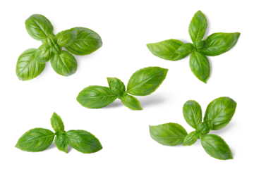 Set of spring leaves and green basil tops in different positions and angles on isolated transparent background. No shadow.  Mediterranean herbs and spices, cooking, vitamins, diet. Cut out. PNG