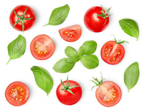 Top view of fresh tomatoes and basil leaves isolated on white or transparent background