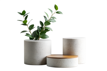 Three concrete pots with plant isolated on white background