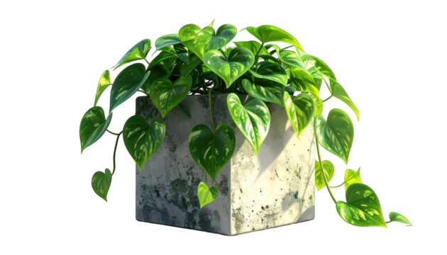 Lush green heart-shaped leaves spilling from a concrete cube planter on black