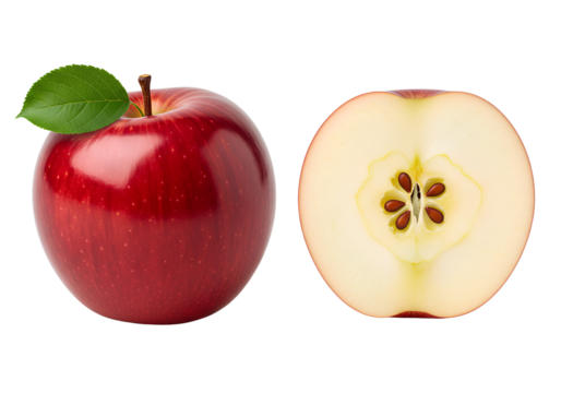 Whole red apple with leaf and cross section isolated, realistic fresh fruit illustration showing seeds and juicy interior