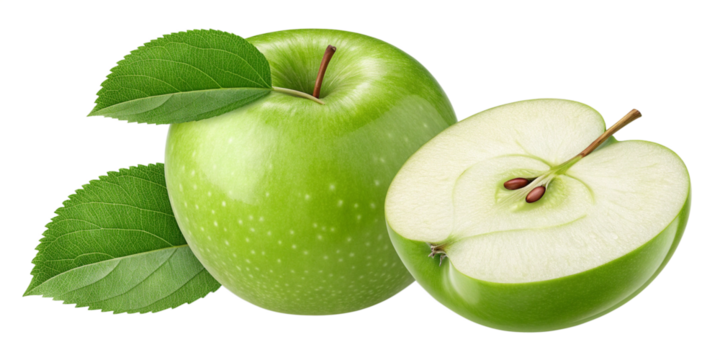 Fresh Green Apple with Leaf and Sliced Half on Transparent Background
