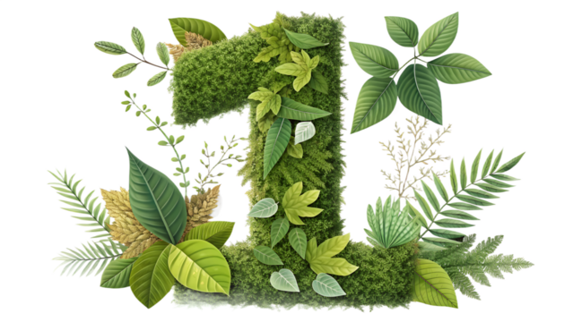ia generated. The number is composed of fresh green foliage, shaped like a natural bush. This transparent PNG is isolated for easy integration.