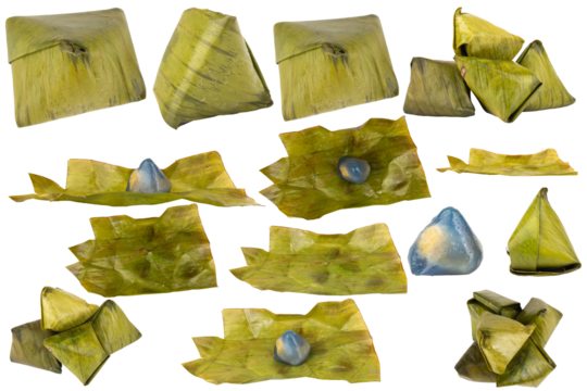 Mumu Pit-baked pork, taro, banana, and vegetables in banana leaves on wooden plate isolated on white transparent background, concept of New Guinea cuisine