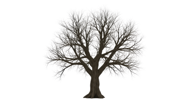 A majestic, leafless oak tree stands tall, its sprawling branches reaching wide against a muted transparent background background removed