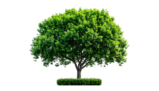 Isolated vibrant leafy tree against a black background with a trimmed hedge border