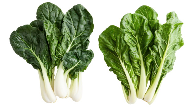 Fresh chard and mustard greens overhead two sets side by side on transparent background
