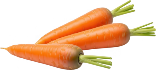 Three fresh ripe raw carrots with green leafy tops are presented in a close up studio shot against a dark backdrop highlighting their vibrant orange color and texture transparent background