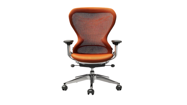 An isolated, front-view of an orange ergonomic office chair on a black background.