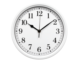 A modern white analog desk clock with a clean design, black hands, and a tilted stand, isolated
