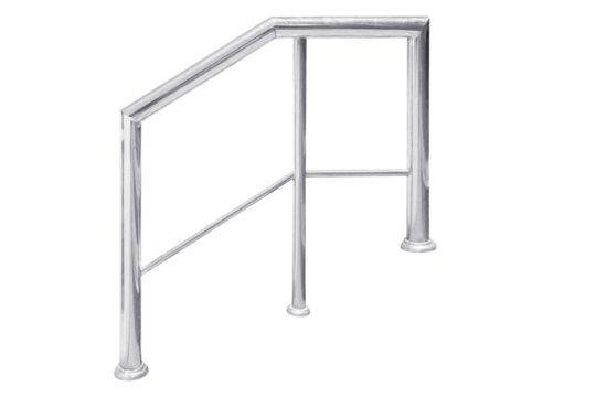 Stainless steel railing isolated on white 10-degree tilt.