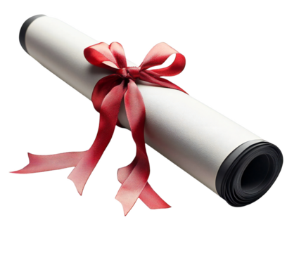 Photo of a rolled diploma or certificate tied with a red ribbon and bow, isolated on a transparent background