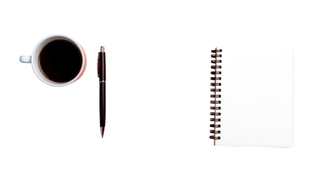 Spiral notebook with blank page and pen isolated on transparent background, ready for writing notes or sketching ideas in a clean and simple setting