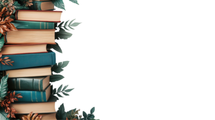 Stack of colorful books surrounded by leaves. transparent background