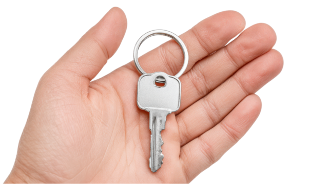 Hand holding a miniature house and key isolated on transparent background, symbolizing real estate, home ownership, and investment opportunities