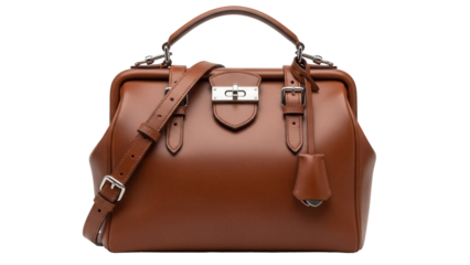 Elegant brown leather doctor s bag isolated PNG, vintage style handbag with top handle and shoulder strap on transparent background