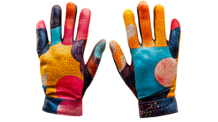 Pair of whimsical leather gloves, colorful pattern, cut out transparent