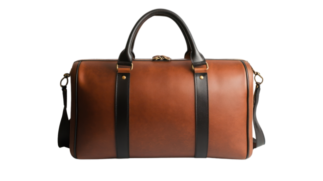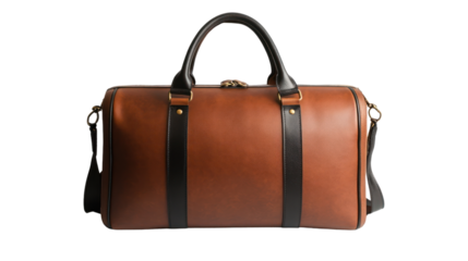 Stylish brown leather duffel bag with contrasting black straps, perfect for travel or gym. Minimalistic design on a white isolated background.