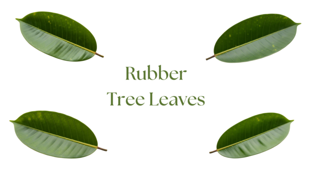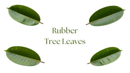 Rubber Tree Leaves PNG Set, Four Highly Detailed 4K Green Rubber Plant Leaves with Broad Oval Shape, Glossy Leathery Texture, and Natural Veins Isolated on White Background for Botanical Design