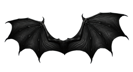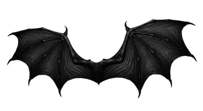 Outstretched, immense, obsidian-black dragon wings with detailed leathery, scale-like texture, isolated on transparent background with dramatic lighting and subtle reflections. Mythical power.